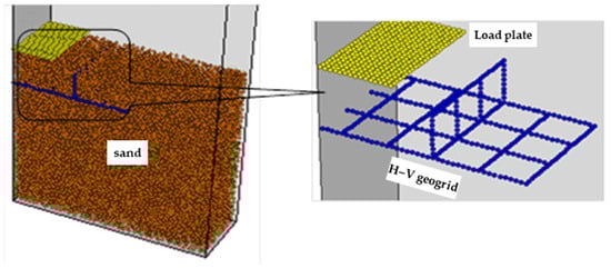 One promising avenue is the development of three-dimensional reinforcement techniques. These techniques involve extending reinforcement both horizontally and vertically within the soil mass, offering the potential for improved interaction with the surrounding soil. Among the recent innovations in this area is introducing a new three-dimensional horizontal–vertical (H–V) geogrid, as depicted in Figure 1. Experimental and theoretical studies have demonstrated the superior interaction strength between H–V geogrids and soil compared to conventional geogrids []. However, despite these advancements, there is still a limited understanding of the reinforcement mechanism of H–V geogrids. This study aimed to fill this knowledge gap by investigating the bearing capacity and reinforcement mechanism of foundations reinforced with H–V geogrids. Leveraging the advanced capabilities of Particle Flow Code in three dimensions (PFC3D), an analysis of the complex behavior of H–V geogrids within the soil matrix was conducted.
