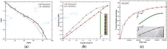 Parameter calibration results: (a) the P–s curve of unreinforced foundation; (b) experimental and simulated tensile force–strain relationships of geogrid in a tensile test; (c) vertical displacement–time step relationships of DEM geogrid in bending test.