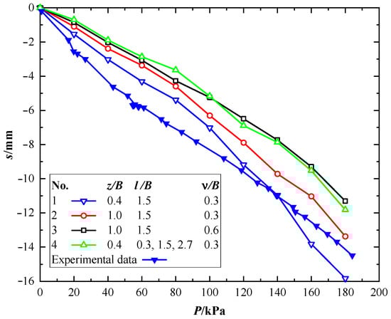Figure 5 depicts the pressure–settlement (P–s) curve relationship using closed symbols for all four simulated cases. The experimental test results, represented by open symbols and consistent with case 1, are provided for comparison. The observed alignment between experimental and simulation data indicates a firm agreement. The findings unequivocally demonstrate that increasing the H–V geogrid’s buried depth enhanced the bearing capacity of foundations, as evidenced by comparing the red and blue lines. Foundations buried at a depth of 1B demonstrated better bearing capacity than those buried at a depth of 0.4B, which has been identified as the optimal value in conventional geogrid–reinforced foundations [,]. Moreover, increasing the height of the vertical elements also played a significant role in improving bearing capacity. For example, foundations with vertical elements at 0.6B height demonstrated a 1.2 times greater bearing capacity than those with elements at 0.3B height, as indicated by the comparison between the black and red lines, with minimal increase in geogrid consumption. Furthermore, increasing the number of vertical elements led to a significant enhancement in bearing capacity. For instance, foundations equipped with three pairs of vertical elements exhibited a substantial 1.3 times increase compared to those featuring only one pair, as demonstrated by comparing the green and blue lines. It should be noted that this enhancement required only a modest 12% increase in geogrid consumption.