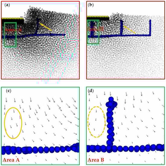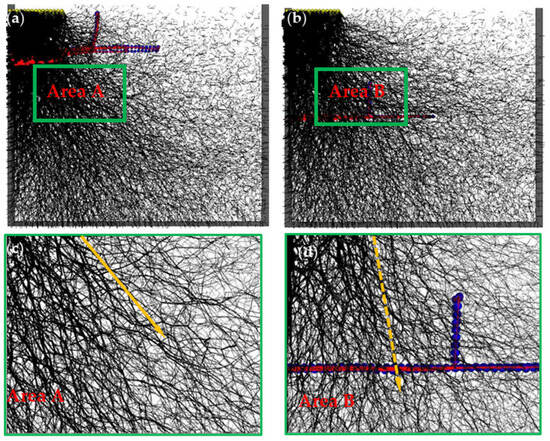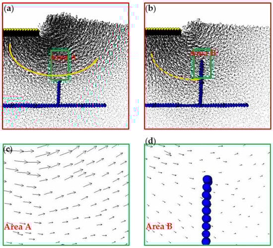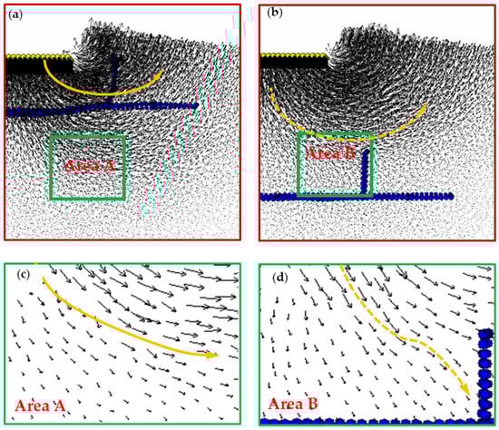Figure 7a,b showcase the displacement distribution with vertical element heights of 0.3B and 0.6B in the H–V geogrid. The soil displacement with 0.6B height vertical elements (Figure 7b) displayed minimal variation and improved uniformity compared to that with 0.3B height vertical elements in Figure 7a. Further comparative analysis between the two figures reveals that the soil in Figure 7a exhibits a more pronounced slip surface (see the orange solid arrow) than that in Figure 7b (see the orange dashed arrow). This suggests that increasing the vertical element height mitigated soil displacement, aiding in the adjustment of uneven settlement and delaying the formation of slip surfaces. The magnified views of areas A and B in Figure 7c,d further highlight that soil within 0.3B height vertical elements tended to move upward to the right in Figure 7c, whereas, in Figure 7d, displacement was bifurcated, with some granules moving upward to the right and the majority moving downward to the right. This distinction underscores how the vertical elements of H–V geogrid alter the direction of soil movement, leading to a broader dispersion of soil granules. Consequently, this slows down the formation of slip surfaces and enhances the “deep-footing” effect of the H–V geogrid, as suggested by Huang et al. (1997) [].