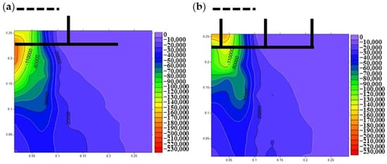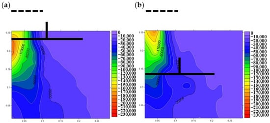 Figure 9a,b illustrate the vertical stress distribution diagrams of the reinforced foundation with H–V geogrid within embedment depths of 0.4B and 1.0B, respectively. The black dotted line indicates the location of the loading plate, as seen in Figure 10 and Figure 11. It is indicated that the H–V geogrid-reinforced foundation with an embedment depth of 1B exhibited better stress redistribution across a wider area than the foundation with an embedment depth of 0.4B. This phenomenon may be attributed to the tighter soil compression between the footing and the H–V geogrid at smaller embedded depths. As the embedded depth of the H–V geogrid increased, the vertical stress distribution in the soil became more uniform. This uniformity can be attributed to the redistribution of overburden loading. Conversely, when the embedment depth of the H–V geogrid was shallow, it could only bear the loading within the local range of the bottom of the footing. This limitation highlights the importance of considering the appropriate embedded depth of the H–V geogrid to ensure effective load redistribution and uniform stress distribution within the reinforced foundation.