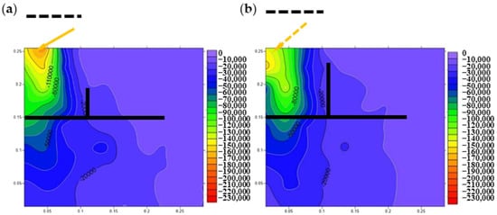 Figure 10a,b illustrate the vertical stress distribution with vertical element heights of 0.3B and 0.6B. In Figure 10a, the vertical stress isolines enclosed by the horizontal and vertical elements are almost vertical. However, increasing the height of the vertical element to 0.6B in Figure 10b resulted in a significantly smaller stress concentration area than 0.3B in Figure 10a. This is attributed to the restriction of soil movement to the right after increasing the height of the vertical element, directing more sand downward (compare solid and dashed orange arrows).