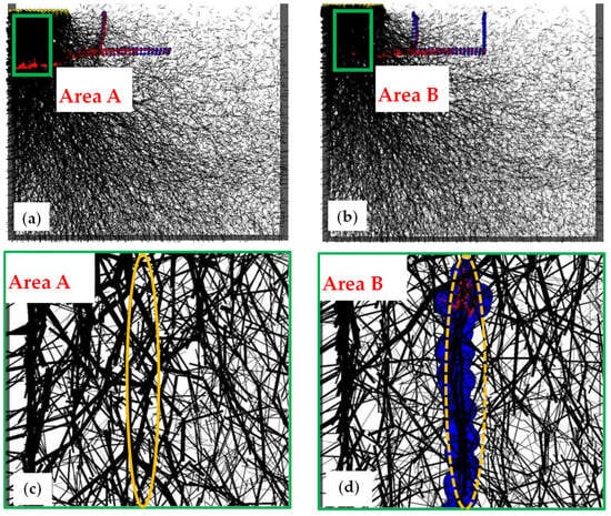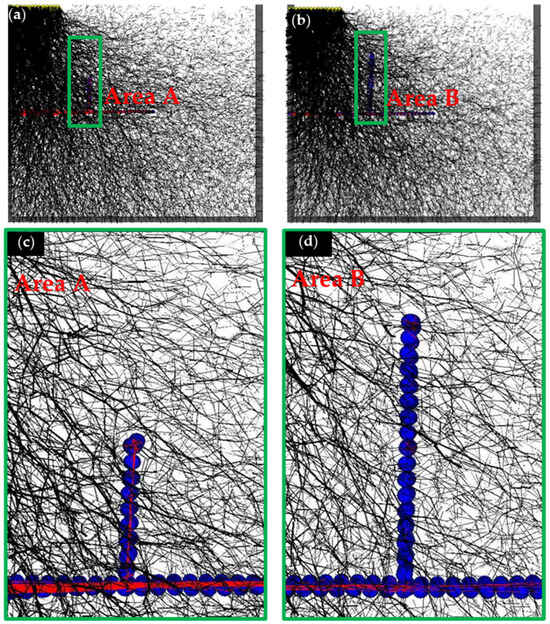 Figure 14a,b depict the contact force diagram for one pair and three pairs of vertical elements within the H–V geogrid. The magnified views of areas A and B provide detailed insights into the distribution of force chains. A comparison between Figure 14a,b illustrates that the force chain within three pairs of vertical elements in Figure 14b appeared thinner and more uniform than that within one pair of vertical elements in Figure 14a, both beneath the strip footing and in the lower right area distanced from the footing. This observation suggests that increasing the vertical elements of the H–V geogrid contributed to a more homogenized stress distribution within the foundation. Further comparison between Figure 14c,d reveals significant differences in the stress distribution of soil surrounded by three pairs of vertical elements in Figure 14d compared to one pair of vertical elements in Figure 14c. The force chains on the left and right sides of the three pairs of vertical elements in Figure 14d exhibited minimal penetration, with most force chains bypassing the upper part of the vertical elements. Additionally, some force chains deflected when passing through the mesh of the vertical elements, as illustrated in Figure 14d, resembling a membrane reinforcement mechanism. This behavior is attributed to the occlusion and locking between the soil and the geogrid meshes, effectively integrating the vertical elements and adjacent soil into a cohesive whole (compare solid and dashed orange ellipses).
