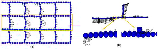 To expedite the PFC simulation process while staying within practical computational limits, the numerical model was streamlined by halving the dimensions of the physical specimen. This decision leveraged the inherent symmetry of the H–V geogrid-reinforced foundation model, as advocated by Wang et al. (2020) []. Additionally, insights from model tests indicate that soil particle displacement remained insignificant beyond 2.3 times the footing width (B) and a depth surpassing 2.3B []. Consequently, five walls with equivalent normal and shear stiffness to the soil particles were integrated as boundary conditions to address this issue. Figure 3 illustrates the details of the boundary conditions. The loading plate measured 0.15 m (width) × 0.598 m (length) × 0.025 m (height), while the box dimensions were 0.125 m (width) × 0.35 m (length) × 0.6 m (height). This strategic substitution effectively minimized soil particle displacement and reduced computation time.