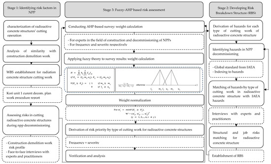 This section explains the methodology employed in our research, which consists of three key stages aimed at comprehensively assessing risks in NPP decommissioning. The first stage involves identifying risk factors inherent in NPP decommissioning. Subsequently, a work breakdown structure (WBS) is established to systematically organize tasks, laying the groundwork for subsequent analysis. The second stage encompasses the development of a risk breakdown structure (RBS), tailored specifically for the decommissioning process, focusing on the identification and correlation of hazards with global standards and real-world operational dynamics. Finally, the third stage entails applying a fuzzy-AHP methodology to calculate risk priorities and weights, utilizing expert judgments synthesized through fuzzy logic-based approaches. All the stages in detail are shown in Figure 1.