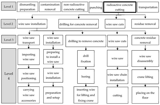 The Project Management Institute (PMI) defines a WBS as “a hierarchical decomposition of the total scope of work to be carried out by the project team to accomplish the project objectives and create the required deliverables. The WBS organizes and defines the total scope of the project and represents the work specified in the current approved project scope statement” [22]. In other words, WBS is breaking down all the work that a project team needs to do to reach its goals and create the necessary outcomes. Due to limited cases and data available on NPP decommissioning, expert opinions were sought for consultation and validation of the WBS. Through this process, a structural risk classification system for various tasks in nuclear decommissioning was identified, along with similarities observed with construction demolition work. Particularly challenging and obscure major decommissioning tasks and operations were subsequently modified and improved. Unlike typical construction demolition processes, nuclear decommissioning operations cannot always proceed in a top-down direction due to the structural uniqueness of a reactor. Due to the presence of radioactive elements in the concrete [23], a detailed sequence and method of dismantling must be applied differently for each section that is being dismantled [24]. Additionally, to secure the narrow space around the radioactive concrete inside the reactor, openings for operations should be installed [25]. Furthermore, pathways and channels should be installed to hedge against structural and personnel-related risks in advance.