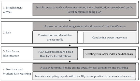 The International Atomic Energy Agency (IAEA) defines preparation guidelines for the establishment of decommissioning plans to protect citizens, workers, and the environment, and to prevent accidents and damages [28]. Most advanced countries in the nuclear field have established safety management systems based on these guidelines and standards provided by IAEA (United States Guidelines [29,30,31]). However, there is diversity in decommissioning technology and related practices, and uncertainties are inherent in specific items, necessitating additional development. Consequently, this study conducted expert consultations while referencing and utilizing international standards to derive risk factors for each nuclear decommissioning operation.