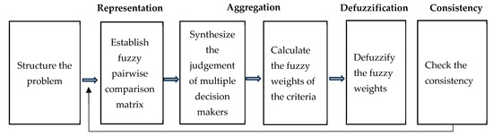 Fuzzy-AHP involves structuring a problem into a hierarchy of goals, criteria, and alternatives, followed by the establishment of a fuzzy pairwise comparison matrix wherein fuzzy sets represent the relative importance of criteria. Expert judgments are synthesized to aggregate opinions, and specialized methods are applied to calculate fuzzy weights of criteria, accounting for uncertainty. A unique step in Fuzzy-AHP involves defuzzification to map fuzzy sets to crisp values for comparison. Furthermore, consistency checks ensure logical coherence among pairwise comparisons, facilitating reliable decision-making amidst uncertainty and vagueness [32,33]. Fuzzy-AHP, introduced by Chang after the research by Laarhoven and Pedryez, uses a triangular fuzzy function as a new complementary method called the expert analysis method [34,35]. This method has been used to complement the shortcomings of AHP by calculating absolute importance. The purpose of adopting the combined fuzzy-AHP method is to address the subjectivity and impracticality limitations of expert judgments in AHP-based pairwise comparisons. Fuzzy-AHP is commonly divided into five phases: (1) pairwise comparison using fuzzy numbers, (2) calculation of the fuzzy synthetic extent value, (3) degree of possibility of the extent value, (4) weight calculation, and (5) weight normalization [36].