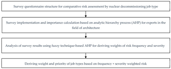 The process of risk assessment based on fuzzy-AHP is structured in the following order: establishing a risk classification system based on expert AHP surveys, followed by the application of fuzzy techniques. In this study, to address the difficulty in obtaining data due to the characteristics of NPPs, a risk derivation and classification system based on expert interviews was established. To overcome the lack of empirical data due to subjective assessments, the fuzzy-AHP technique was applied to complement the existing evaluation method with a probabilistic and statistical approach. A survey was conducted based on the analytic hierarchy process (AHP) targeting experts in the field of architecture. Importance was calculated through the survey. For assessing the importance of structural and human risks, a two-step hierarchical paired comparison was conducted for a total of 42 items (21 each for frequency and severity). The survey participants were professionals with over 10 years of experience in the field of architecture, and a total of 27 experts (Table 6) responded to the survey for analysis. The applied process is shown in Figure 5.