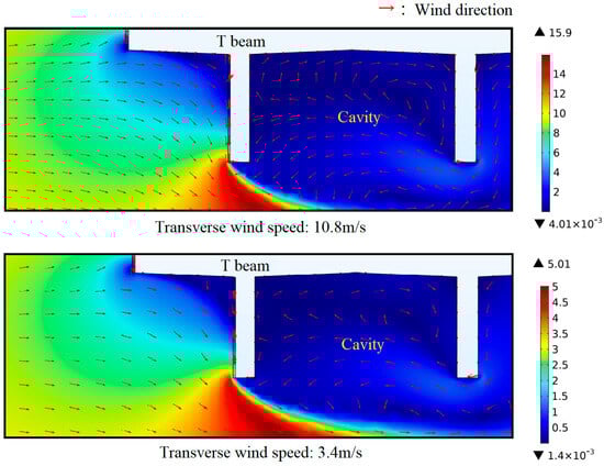 - Wind slows down in the cavity, which reduces heat convection loss (Figure 4 shows the wind speed distribution across the T-beam structure under the action of transverse wind, and the wind speed in the cavity therein is decreased).