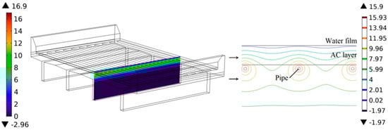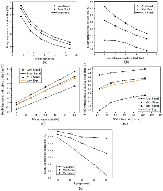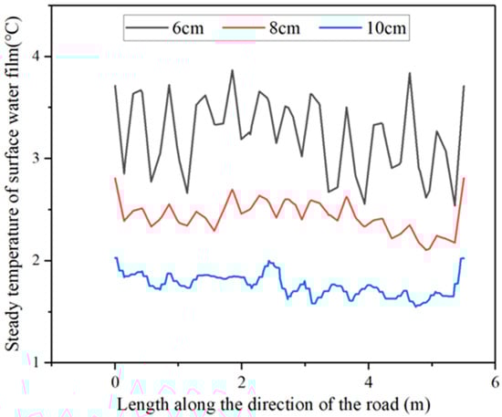 - The variation in the asphalt concrete (AC) layer’s thickness determines the distance between the pipe system and the surface water film, directly affecting the heat transfer. The simulation result indicates that increasing the AC layer thickness leads to a gradual decrease in the water film temperature, along with a reduction in the difference between the maximum and minimum temperatures (see Figure 8b).