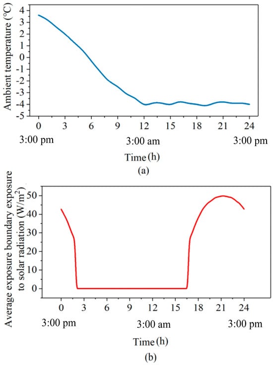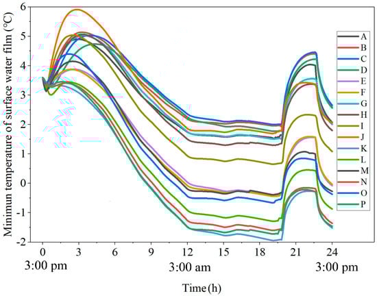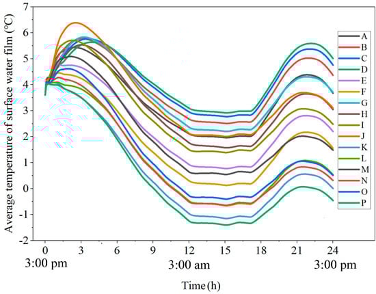 - Wind speed directly impacts the thermal convection of the surface, leading to a reduction in the temperature of the water film as wind speed increases. However, the cooling effect slows down. The simulation result demonstrates the significant influence of wind speed on the water film temperature (see Figure 8a). For instance, as the wind speed increased from 1.6 m/s to 10.6 m/s, the average water film temperature decreased by 5.6 °C in the simulation. When the wind speed exceeded 10 m/s, the minimum temperature of the water film dropped below 0 °C;