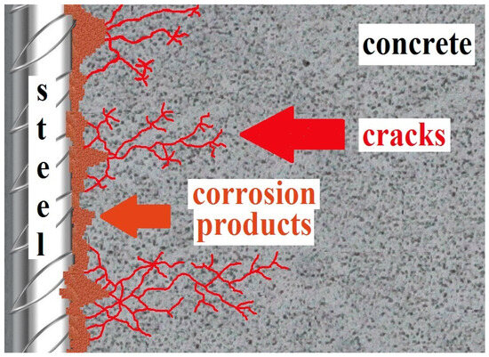 At present, the corrosion of concrete reinforcement is the most important issue limiting the service life of reinforced concrete structures [1,2]. Although the surface of conventional carbon steel reinforcement is protected by the natural alkalinity of the concrete pore solution, significant corrosion may develop mainly due to the carbonation of the concrete cover layer (the reduction of the pore solution pH by CO2 and NOx from the ambient atmosphere) and/or the ingress of chloride anions (the application of de-icing salts and seawater) [3,4,5,6,7]. The resulting voluminous corrosion products cause cracks in the cover layer, increasing the ingress of corrosion stimulants and significantly reducing the reinforcement bond strength in concrete [8,9]—see Figure 1.