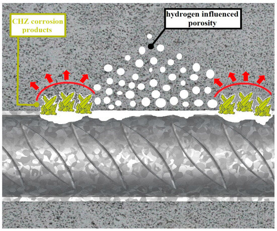 Scheme of changes in ITZ due to the corrosion of the hot-dip galvanized coating in concrete (generation of hydrogen bubbles and precipitation of CHZ corrosion products—the figure takes into account the conclusions of article [25]).