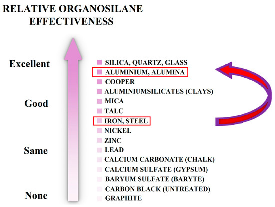 Showing the difference in reactivity with organofunctional silane between steel and aluminium oxide (alumina—Al2O3)—reprinted from [35].