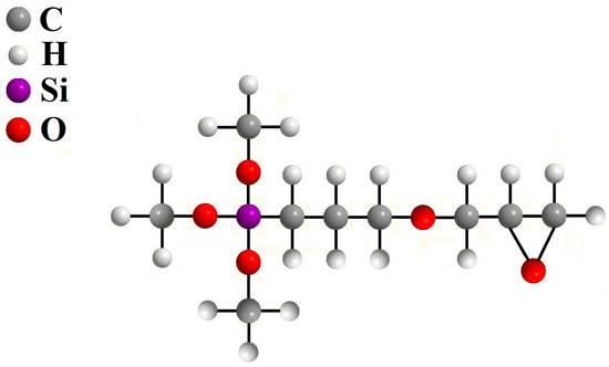 The first goal of this study is to assess the effectiveness of the application of mono-silane (organofunctional silane) 3-glycidyloxypropyltrimethoxysilane (GPTMS—see Figure 6) in sealing open pores in plasma-sprayed Al2O3 coating on steel reinforcement surfaces. Although organofunctional silanes have been marginally tested before in sealing pores in ceramic coatings, the commercially available organofunctional silane GPTMS has never been tested. The application advantage for the coatings industry in using this organofunctional silane is based on the availability of the formulation in a pre-hydrolysed and oligomerized form. This formulation is also significantly more affordable than more expansive bis-silanes. However, the effect of organofunctional silanes on reinforcement bond strength has not been investigated either. Considering that the theoretical basis suggests (see Figure 3—higher reactivity with silica phase) a favourable effect of organofunctional silanes on bond strength, the second goal of this study is to verify this hypothesis by means of an experimental campaign.