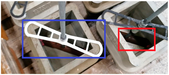 Images of plain steel bars centred at the centre of cube forms. The red annotation shows the bottom wooden insert. The blue annotation shows the top 3D-printed polyacrylate clamps.
