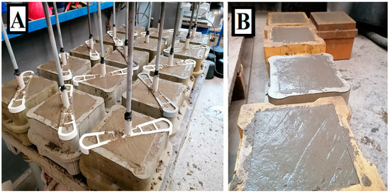Image (A) shows 28 cube forms with plain steel bars for the bond strength test. Image (B) shows 5 samples without plain steel bars for the concrete compressive cubic strength test.