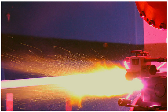 A total of 21 plain steel bars and 12 flat steel samples were plasma-sprayed with Al2O3 coatings (APSS), as shown in Figure 9. Medium-purity (95.5 wt.%) alumina oxide powder AH 240 was applied (due to the relatively low price of the powder) using a hybrid water-stabilized plasma torch WSP-H 500 (The Czech Academy of Sciences—Institute of Plasma Physics). Before the alumina oxide application, the steel sample surface was sandblasted with corundum abrasive. The final surface roughness was 5.5 µm (Ra). The plasma torch output was 150 kW, generated by a direct current of 500 A. The resulting electric arch between the tungsten cathode and the inner cooled rotational anode had an outlet temperature of 25 000 K, and the flow speed was 7000 m·s−1. The plasma enthalpy was approximately 300 MJ·kg−1. The Al2O3 powder was fed to the plasma jet at a feeding distance of 75 mm, and the spray distance was 450 mm. The chosen distances promote the formation of a harsh coating with higher porosity, reducing the required amount of Al2O3. The coating application was performed in two layers, resulting in a total thickness of 220 µm. Between layer depositions, the steel surface was cooled with pressurized air to reach a temperature of 110 °C.