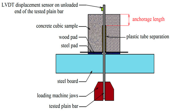Experimental setup of pull-out bond strength test between a plain bar and normal strength concrete—anchorage length is in red.