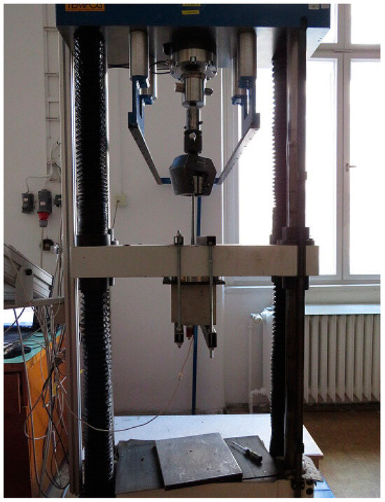 The pull-out test, as described by RILEM RC6 [44] and ASTM C234-91a [45], was performed to assess bond strength. The bond strength of coated steel bars with concrete compared to uncoated plain steel bars was assessed by means of a bond stress slip. The slip was measured using an LVDT sensor (Micro-Epsilon Messtechnik GmbH, Ortenburg, Germany) located at the opposite end of the loaded steel bar sample. The anchorage length was given by the concrete cube sample and plastic tube separation, as shown in Figure 10. The pull-out test was performed using the 100 kN TIRA test machine (Figure 11). The displacement of the unloaded end of the plain bar controlled the test. A constant loading rate of 0.005 mm·s−1 was applied. The test was terminated after reaching a slip of 2.0 mm.