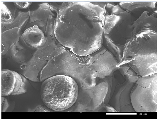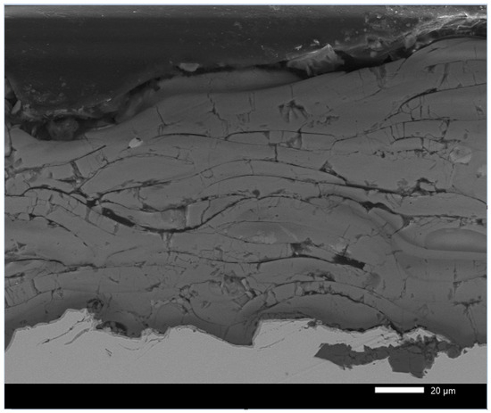 Figure 12 shows the SEM image of the outer surface of the plasma-sprayed Al2O3 coating (APSS) on the surface of a flat steel sample. The APSS coating has a typical splat structure with spherical grains with a most common diameter of 30–50 µm [46,47]. Cracks and smaller pores are visible between the outer splats. However, more significant pores are seen at the splat boundaries between the individual spherical splats. The cross-section of the APSS coating (Figure 13) reveals the presence of typical semi-molten and unmolten particles with a typical porosity of 2–5 µm. However, this figure also shows continuous porosity greater than 5 µm with cavern formation in the coating [48,49]. Through capillary phenomena, the filling of these caverns with outer electrolyte can occur. However, Figure 13 also shows the typical presence of semi-molten and over-molten particles of oxide impurities in the used AH 240 powder [49,50]. Considering the expected presence mainly of α-Al2O3 in the APSS coating on steel, an open porosity of approximately 4.4% can be expected [51]. However, porosity measurements using mercury porosimetry (see Figure 14) on flat samples showed the very frequent presence of pores of 5 µm pore diameter, but also pores with a diameter significantly larger than 10 µm. The total porosity of the flat samples was determined to be around 0.15% on average.