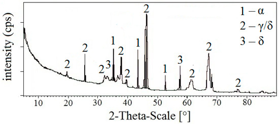 Figure 15 shows the results of the measurement of APSS coating phase composition using X-ray diffraction (the thickness of the coating prevents the detection of the underlying steel). From the results, it is clear that the coating is formed only through the modification of Al2O3. The impurity content of the powder used is only influenced by the presence of the different Al2O3 modifications. The α-Al2O3 phase is only represented by approximately 22 wt.%, the γ/δ-phase is the most represented (approximately 70 wt.%), and the δ-phase is the least represented (approximately 8 wt.%). A similar APSS coating composition on carbon steel was previously achieved using torch WSP-H 500 [52]. The obscuration of these phases and the relatively higher impurity content condition the observed porosity of the APSS coating.