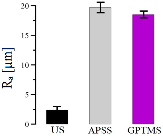 A comparison of the roughness of plain steel bar samples without coating (US), with APSS coating only, and finally APSS with GPTMS (topcoat) is shown in Figure 16. It is evident that the application of plasma-sprayed Al2O3 coatings increases the surface roughness (Ra) of the plain steel bars by approximately a factor of 10, and it is also evident that the thickness of the GPTMS coating does not significantly reduce the natural porosity of the APSS coating.