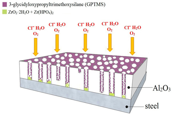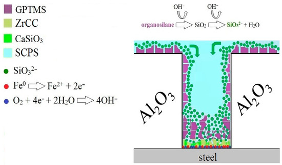 However, adsorption on the carbon steel surface is quite difficult for silanols, and the number of free OH groups on the metal surface plays an important role (see Figure 5). Neither the clean metal surface nor the conventional steel corrosion products (polymorphs of FeO(OH)) are suitable surfaces for the application of organofunctional silanes [56,57]. For this reason, it is very often recommended to expose the steel to an alkaline environment (pH ideally close to the isoelectric point, i.e., 9.5) [57] or to pickle the surface in sulfuric acid [58,59]. Sufficient amounts of OH groups for good adhesion to organofunctional silane can provide conversion coatings; in this respect, CeIII-based coatings [60,61,62], phosphate coatings [63], and zirconium-based coatings [64,65], among others, have been successfully tested. The additions of Zr(NO3)4 directly to silane baths enhance the barrier protective effects of the resulting coating [66]. In engineering practice, zirconium (ZrCC)- and titanium (TiCC)-based conversion coatings are very often used in painted steel technology (often in combination) as a modern phosphate-free and chromate-free (CrVI)) process [67]. Based on these facts, the application of ZrCC was preferred over other conversion coatings in this work. It is assumed that during the coating of APSS with ZrCC, the precipitation of ZrO2·2H2O and Zr(HPO4)2 (the phosphate formed is ultimately minor) occurs according to reactions (4)–(6) in the open pores of APSS on the steel surface. The conversion coating thus formed on the steel surface significantly improves the adhesion properties of organofunctional silane (GPTMS). It is further established that GPTMS adsorbs very readily to the APSS surface (even to the inner surface of open pores in the APSS coating) to form a continuous coating. These assumptions are shown in Figure 17.
