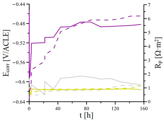 Time dependency of Ecorr and Rp for four parallel samples in simulated concrete pore solutions (overview; curves—mean values).