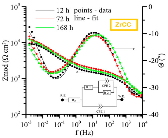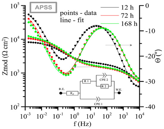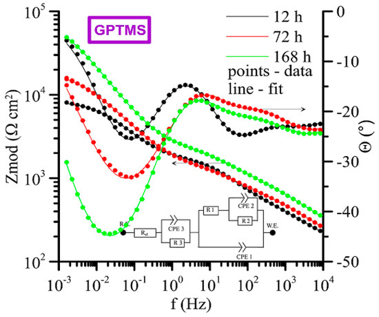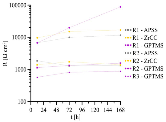 The measured impedance spectra (Bode plot: log Zmod vs. log frequency and phase angle vs. log frequency) with equivalent circuits used for its fitting are shown in Figure 19 (APSS coating only), Figure 20 (APSS coating with ZrCC), and finally Figure 21 (APSS coating with ZrCC and GPTMS). In the equivalent circuits (ECs), Rel is solution resistance, and R1 and CPE1 represent pore solution resistance and Al2O3 layer capacity, respectively. R2 and CPE2 represent phase boundary steel-pore solution. R3 and CPE3 are associated with the high-frequency region and represent the influence of GPTMS. The used ECs are in the good agreement with the proposed ZrCC and GPTMS mechanism stated in Figure 17. The results of the specific resistances (R1 to R3) after 12 h, 72 h, and finally 168 h of exposure are plotted in Figure 22. The charge transfer resistance (R2) for all three types of samples is the key to the evaluation of the corrosion process. There was a gradual increase during the exposure for the APSS samples, indicating a slight stabilization of the passive layer due to the alkaline environment (the protective effect of OH− anions in SCPS is more significant than the stimulating effect of Cl−). In the case of samples with ZrCC addition, the situation was similar; there was only a slight increase in the charge transfer resistance (R2), probably caused by the inhibition effect. There was a significant increase in R2 in the case of GPTMS samples. This again indicates the inhibition of corrosion damage to steel by molecules released from the organofunctional silane coating (adsorption inhibition mechanism). The resistance R1 (pore resistance) in the case of APSS decreased slightly during the exposure; this could be due to the increasing concentration of ions in the pores. In the case of the ZrCC samples, there was a slight increase in R1 compared to APSS, indicating lower conductivity. For the GPTMS samples, an equivalent circuit with one extra R-C element (R3, CPE3) was used. This element represents the top layer of the organosilane, which can form molecules large enough to partially block open pores up to 10 μm in size. Both R1 and R3 increased slightly during exposure, which may indicate the formation of larger molecules that subsequently increased surface and pore blockage.