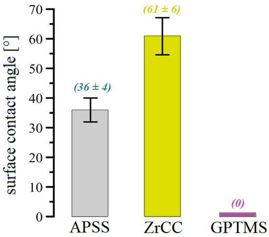 The roughness of the APSS coating is significantly higher than that of uncoated plain bars (see Section 3.1 and Figure 16) and is not significantly affected by the GPTMS coating. Thus, it is very likely that the increased roughness of APSS specimens will provide a significant increase in the bond strength of plain bars in concrete [25,76]. The surface contact angle is also important for the bond strength of the coated reinforcement in concrete. A good surface wettability of the coated concrete reinforcement ensures the perfect coverage of the surface with cement paste (the occupation of the surface by portlandite—Ca(OH)2 crystals), which results in a higher bond strength [25,78,79]. The low surface wettability (high surface contact angle) of epoxy coatings results in a lower bond strength of the coated reinforcement in concrete [17,80,81]. For these reasons, the effect of the different surface treatments (APSS without topcoat, ZrCC, and GPTMS) on the steel surface contact angle was verified, and the results are shown in Figure 24 and subsequently in the bar chart in Figure 25. From the results, it is clear that the contact angle for the APSS sample surface (without topcoat) is approximately 36°, and the subsequent surface treatment via ZrCC increases the wetting angle (increases the surface hydrophobicity) to a wetting angle value of approximately 61° (the reason for this may be the formation of specific ZrF62−-rich Al-rich jagged structures, giving the surface a lotus flower effect [82]). If the topcoat is composed of ZrCC and GPTMS, the surface hydrophilicity increases very significantly (the wetting angle is 0°). It is evident that GPTMS can significantly cover the surface of the plasma-sprayed Al2O3 coating and avoid the influence of ZrCC on the intrinsic wettability of the surface. A prior application of ZrCC is not strictly necessary to apply GPTMS to the APSS effectively. The reason for the increase in the wettability of the Al2O3 surface is the presence of OH groups from the open oxirane ring of 3-glycidyloxypropyltrimethoxysilane [83,84]. The surface Al2O3 plays a significant role in the hydrophilic properties of GPTMS—hence the considerable level of compatibility of the two solids.