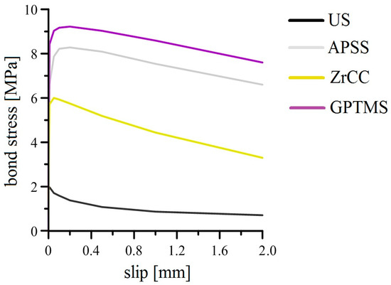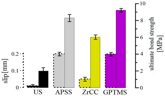 The roughness of plain uncoated steel (US) bars, APSS, and GPTMS samples was measured before the bond strength test. Each of the 5 randomly selected samples was measured in 3 lengthwise tracks with the Mitutoyo SJ-400 device (Mitutoyo, Kawasaki, Japan). The wettability of flat- coated steel samples (APSS, ZrCC, and GPTMS) was measured with the SEE System (ADVEX Instruments, Brno, Czech Republic) goniometer, using the sessile drop technique with distilled water. The measurements were carried out on a total of 4 parallel samples (each sample was measured at 3 different locations).
