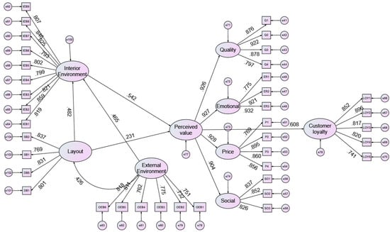 The results of path coefficients of path analysis show that the layout (b = 0.486, p < 0.001) and external environment (b = 0.612, p < 0.001) significantly impact the internal environment, and H1 and H2 are supported with 64% of the variance explained, as shown in Table 6 and Figure 3. The internal environment (b = 0.754, p < 0.001) and the layout (b = 0.323, p = 0.001) significantly impact the perceived value, thus H3 and H4 are supported with 51.7% of the variance explained. The perceived value (b = 0.563, p < 0.001) significantly affects customer loyalty; therefore, H5 is supported with 37% of the variance explained. Criteria of variance inflation factor (VIF) are lower than three (between 1.000 and 1.221), which indicates that the probable collinearity is not significant [111].