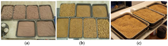 The quantity of water required for homogenization, hydration, and structural formation of the prepared mixtures was assessed by considering the indicators of each type of tuff filler, such as water absorption and surface water retention capacity, grain composition, and specific surface area. The water/solid mass ratio in the developed compositions is within 0.10–0.12 [33]. Figure 1 shows the sieving sands from the tuff wastes used in the developed compositions.
