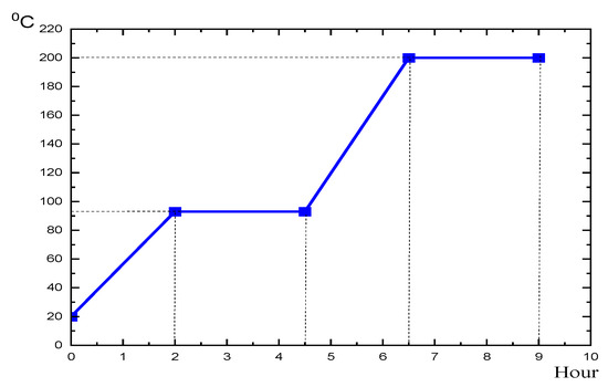 According to Figure 2, heat treatment was performed in the following order: temperature rise from 20 to (90 ± 5) °C for 2 h, keeping at a specified temperature for 2 h and 30 min, followed by a temperature rise to 200 °C for 2 h, keeping at a specified temperature for 2 h and 30 min, and gradual cooling to a room temperature.
