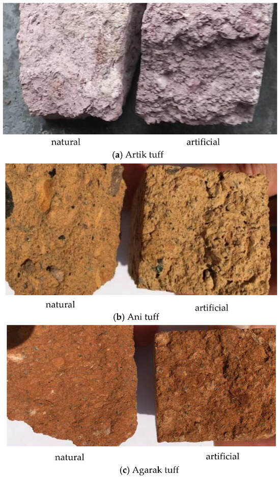 Natural tuff stones of (a) Artik, (b) Ani, and (c) Agarak deposits and images of cementitious artificial stones made with compounds processed with industrial waste and the composite binder.