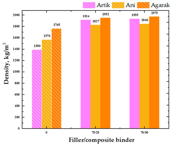 In Figure 4, a comparison of the density indicators of natural stone from the Artik, Ani, and Agarak mines (with a dashed line) and artificial stone materials made from waste from the same mines (without a dashed line) is presented.