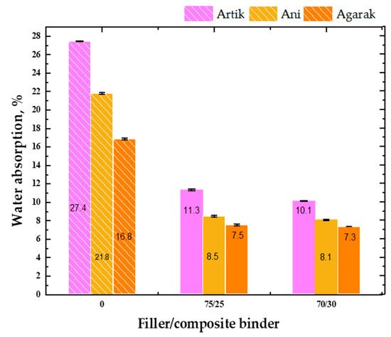 Figure 5 presents a water absorption indicator comparison of natural stone from the Artik, Ani, and Agarak mines and artificial stone materials made of waste from the same mines.