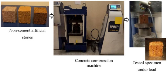 The 50 mm × 50 mm × 50 mm dimensions cube samples compressive strength test was defined by AST 100-94 and EN 1926:2006 [34,35] standards using a hydraulic compression testing machine with a measuring range of 2000 kN (the Italian Matest (Treviolo, Italy) C089, 2000 kN automatic Servo-Plus Progress Concrete compression machine was used to determine the compressive strength of samples with an accuracy of 0.001 kN). After placing the specimen on the machine’s lower baseplate in a coaxial position, it was subjected to a compressive load (P) until failure by smoothly lifting the lower support. For natural stone materials, the standard speed is 0.3–0.5 MPa/s.