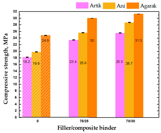 The compressive strengths of the artificial stone materials made with Artik tuff compositions №1 and №2 were 23.4 MPa and 25.5 MPa, respectively, and 18.2 MPa of the natural stone from the same mine (Figure 6). With tuff deposits from the Ani mine, the following values were obtained: the artificial stone materials made with composition №3 and №4 had compressive strengths of 25.6 MPa and 28.7 MPa, respectively, and the natural stone of the Ani mine had a compressive strength of 19.8 MPa. In addition, with compositions №5 and №6 made with Agarak tuffs, the compressive strengths were 30.0 MPa and 31.3 MPa, respectively, and 24.8 MPa for natural stone from the same mine. Figure 7 compares the compressive strength indicators of natural stone from the Artik, Ani, and Agarak mines with those of artificial stone materials made of waste from the same mines.