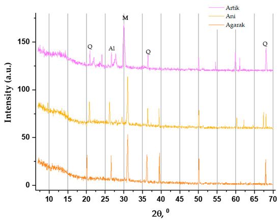 X-ray analysis results of non-cement artificial stone materials of Artik, Ani, and Agarak tuff wastes. (Q—quartz, Al—Albite, M—Muscovite).