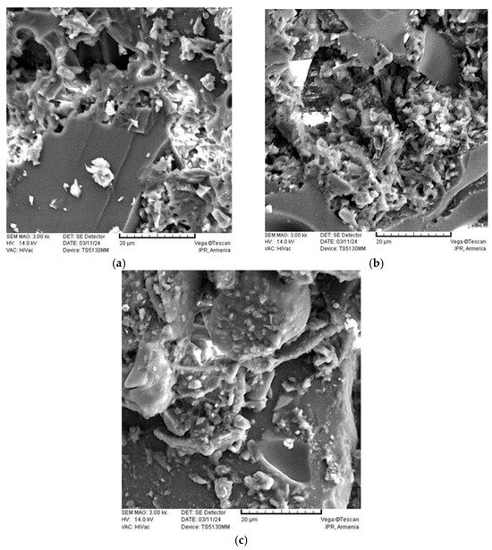 Scanning electron microscopy (SEM) is the best way to study the morphology of the resulting materials on a scale increased several times. SEM images taken at 3000× magnification of non-cement artificial stone samples treated with composite binder and tuff sands are shown in Figure 9a–c.