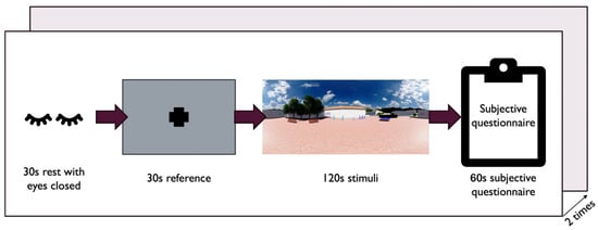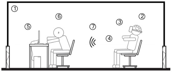 At the start of the experiment, participants were assisted in donning the experimental equipment, EEG, and head-mounted display (HMD) and briefed on the experimental procedure and precautions to ensure the smooth progression of the experiment. The experimental environment and the participant’s location were displayed, with Figure 3 showing that the participant’s physical experimental environment was in a closed, quiet setting, and data collection was conducted wirelessly.