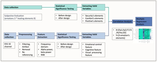 The study is primarily divided into three main parts (as shown in Figure 5): subjective evaluation, EEG data analysis, and correlation analysis. The subjective evaluation is conducted through statistical significance testing to identify the top three healing elements corresponding to the three emotions with higher scores. In the EEG data analysis, the data are first pre-processed, which includes filtering, artifact removal, re-referencing, and feature extraction. Then, statistical significance testing is used to identify characteristic values in brain regions involved in emotional regulation, cognition, and visual analysis. Finally, the study conducts correlation and multiple regression analyses between the three healing elements corresponding to the three emotions and the brain characteristic values.