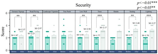 For the design of a sense of security, the seating, lighting, and trees in the healing landscape received higher scores after the design. As shown in Figure 6, the seating after the design gave people a higher sense of security (M = 3.40; SD = 0.38; p < 0.01) than before the design (M = 1.76; SD = 0.23; p < 0.01). The lighting after the design gives people a higher sense of security (M = 3.26; SD = 0.61; p < 0.05) than before the design (M = 1.70; SD = 0.49; p < 0.05). The arbor after the design gives people a higher sense of security (M = 3.17; SD = 0.97; p < 0.01) than before the design (M = 1.76; SD = 0.32; p < 0.01).