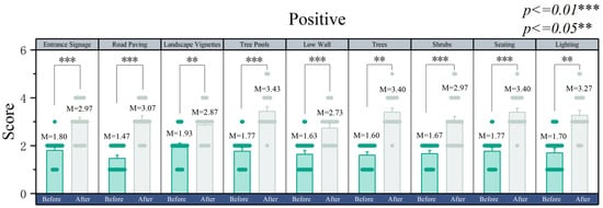 For the positive design, the shrubs, tree pools, and trees in the healing landscape after the design received higher scores. As shown in Figure 8, the shrubs after the design gave people higher positives (M = 3.57; SD = 0.39; p < 0.01) than the ones before the design (M = 1.70; SD = 0.36; p < 0.01). The tree pools after the design give people more positives (M = 3.43; SD = 0.53; p < 0.01) than the ones before the design (M = 1.76; SD = 0.32; p < 0.01). The arbor after the design gives people a higher positive (M = 3.40; SD = 0.38; p < 0.05) than the one before the design (M = 1.60; SD = 0.25; p < 0.05).