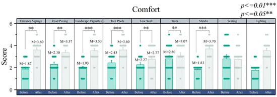 For the design of comfort, the shrubs, entrance signage, and tree pools in the healing landscape after the design received higher scores. As shown in Figure 7, the shrubs after the design gave people a higher sense of comfort (M = 3.70; SD = 0.42; p < 0.01) than before the design (M = 1.83; SD = 0.28; p < 0.01). The entrance sign after the design gives people a higher sense of comfort (M = 3.60; SD = 0.52; p < 0.05) than before the design (M = 1.86; SD = 0.53; p < 0.05). The tree pools after the design give people a higher sense of comfort (M = 3.60; SD = 0.59; p < 0.01) than before the design (M = 2.40; SD = 0.73; p < 0.01).