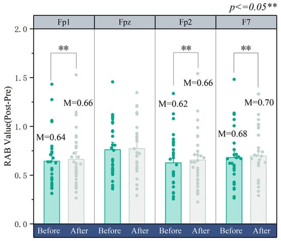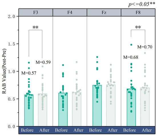 F3 (left prefrontal lobe) is often associated with the processing and regulation of positive emotions []. The area near frontal electrode pairs (such as F3/F4 or F7/F8) may be related to nonverbal emotional expression and understanding []. As shown in Figure 10, the results from the frontal electrodes are as follows: after the design, the RAB values for F8 (M = 0.748; SD = 0.149; p < 0.05), F7 (M = 0.690; SD = 0.143; p < 0.05), and F3 (M = 0.582; SD = 0.102; p < 0.05) were greater than the RAB values of F8 (M = 0.737; SD = 0.146; p < 0.05), F7 (M = 0.681; SD = 0.144; p < 0.05), and F3 (M = 0.573; SD = 0.098; p < 0.05) before the design.