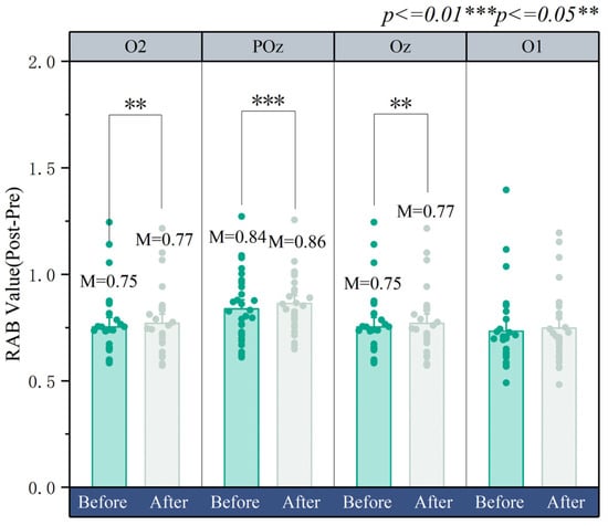 POz plays a role in visual processing, affecting visual perception, visual attention, and visual memory []. As shown in Figure 11, the results of this experiment show differences in the RAB values at the POz location before and after the design, with an increased activation of RAB after the design (M = 0.851; SD = 0.112; p < 0.01) compared to before (M = 0.838; SD = 0.107; p < 0.01). This indicates that visual perception is more intense after the design. It can also be observed from the right occipital lobe O2 that the subjects exhibited increased activation in RAB values for the healing landscape after the design (M = 0.741; SD = 0.128; p < 0.05) compared to before the design (M = 0.734; SD = 0.130; p < 0.05). This indicates a stronger analysis and perception of image features received by the left eye.